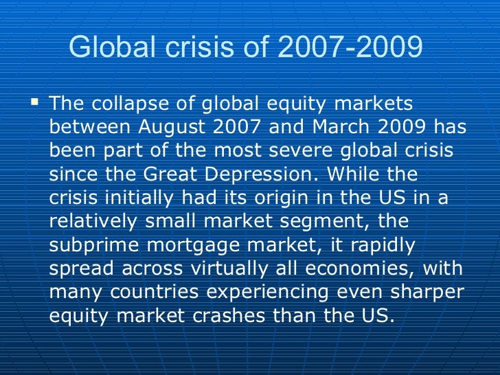 The International Impact of the Subprime Mortgage Meltdown The collapse of the U.S. subprime mortgage market triggered an international financial crisis that now stretches from Norway to China those backed by subprime mortgages.6 The subprime lending market collapsed in 2007 as the housing ... View Full Source