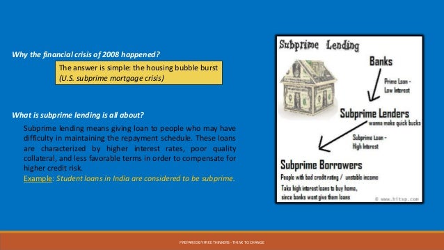 A broader trend of lowered lending standards and higher-risk mortgage products. Further, Shocks of Subprime Crisis on Indian Economy when India’s stock market started falling. On July 23, ... Document Viewer